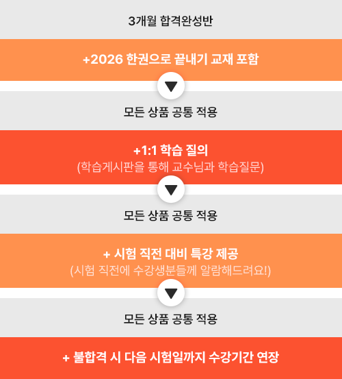 - [3개월 합격완성반/1개월 단기속성반] 상품 모두 교재를 제외한 혜택(특강2종/불합격시수강연장/직전대비특강/1:1학습문의)이 적용됩니다.