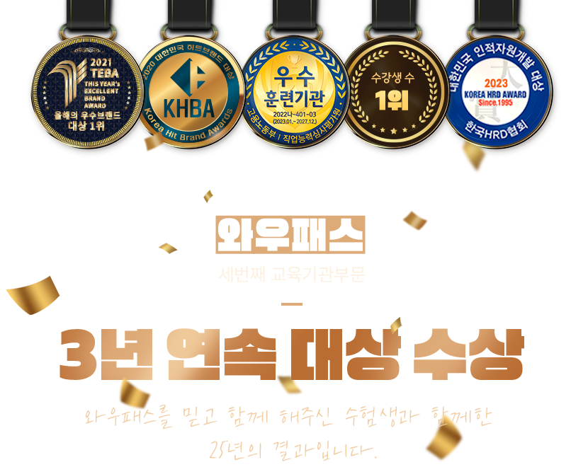 국제무역사, 회계관리, TAT/FAT, ADsP, SQLD, 매경TEST, 보세사, TESAT, 파이썬 과정 수강생 수 1위(2023년도 한국이러닝협회 운영 과정 실적기준)